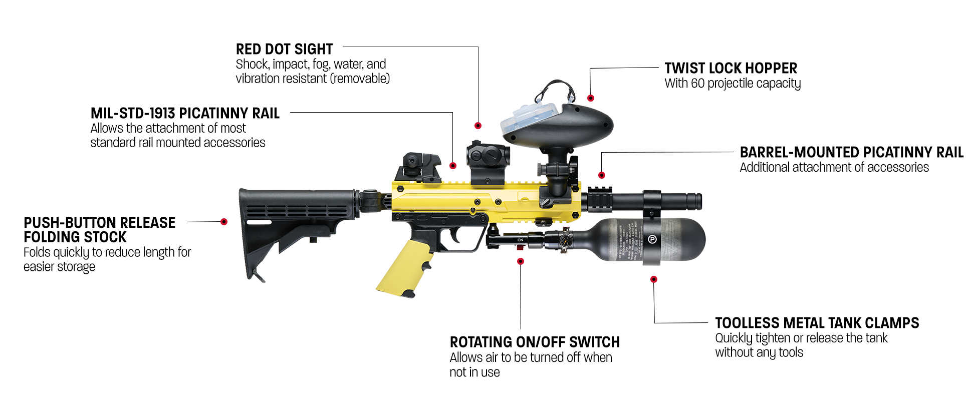 Controls and handling are set up for real-world conditions. A silicon-textured grip stays planted when gloves, rain, or stress are part of the call, and the variable universal ASA with ON/OFF valve supports straightforward air management. Toolless grip frame removal with an M4 AR grip helps simplify servicing and configuration, while a barrel mount Picatinny rail supports practical setup options. A two-point sling keeps the launcher secure and accessible, and a red dot optic supports accurate operations.